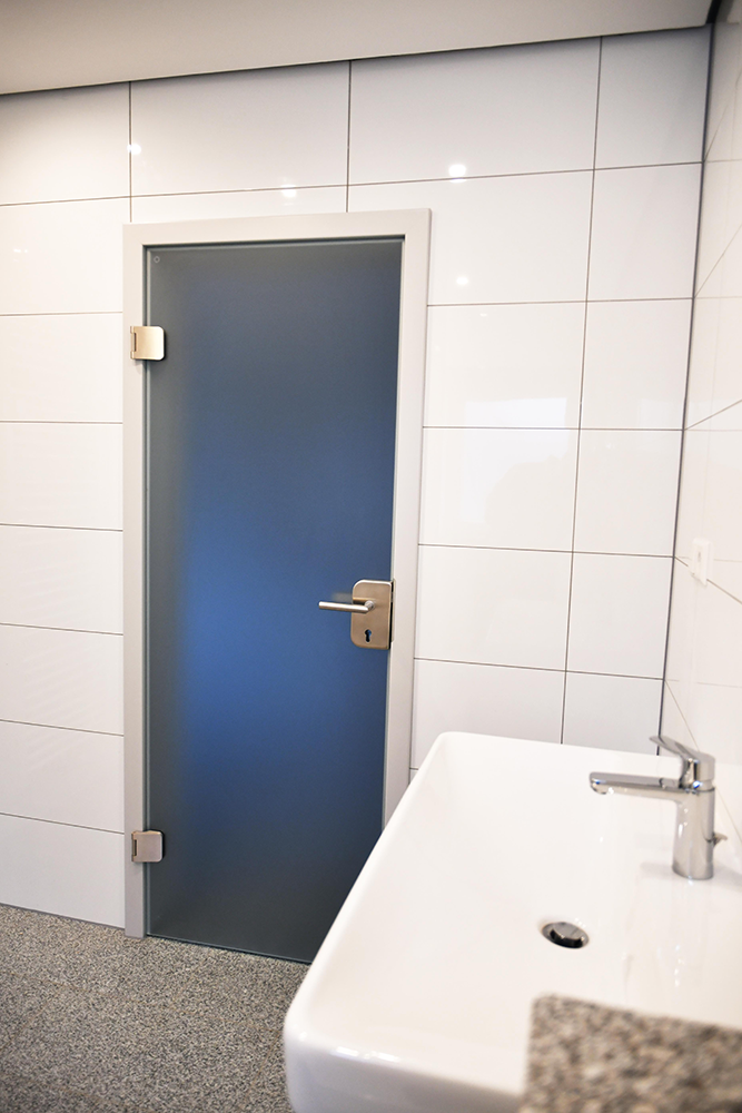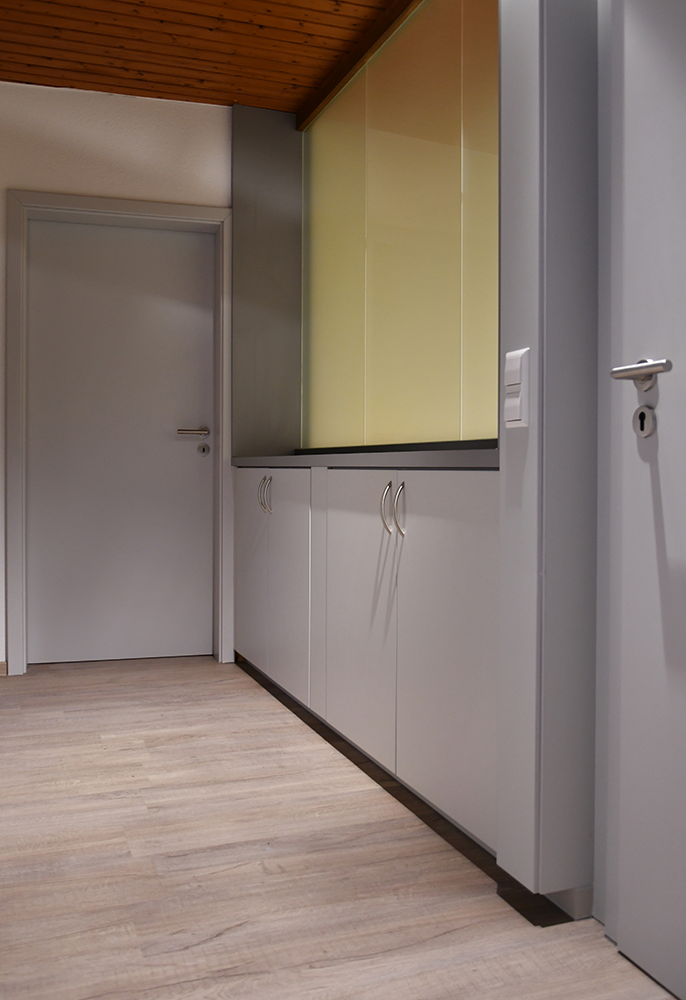 – Maßgefertigte Einbaumöbel im Eingangsbereich als Treppenhausabtrennung (teilweise Glas)